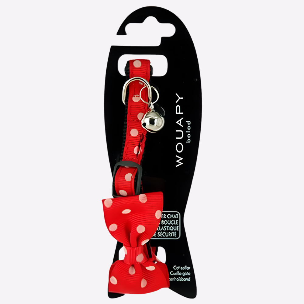 Le Collier nœud rouge pour chat de Wouapy© est un accessoire élégant, confortable et sécurisé. Grâce à son galon rouge à pois et à son nœud papillon coulissant parfaitement assorti, il apporte une touche chic tout en restant adapté au quotidien des chats les plus exigeants.