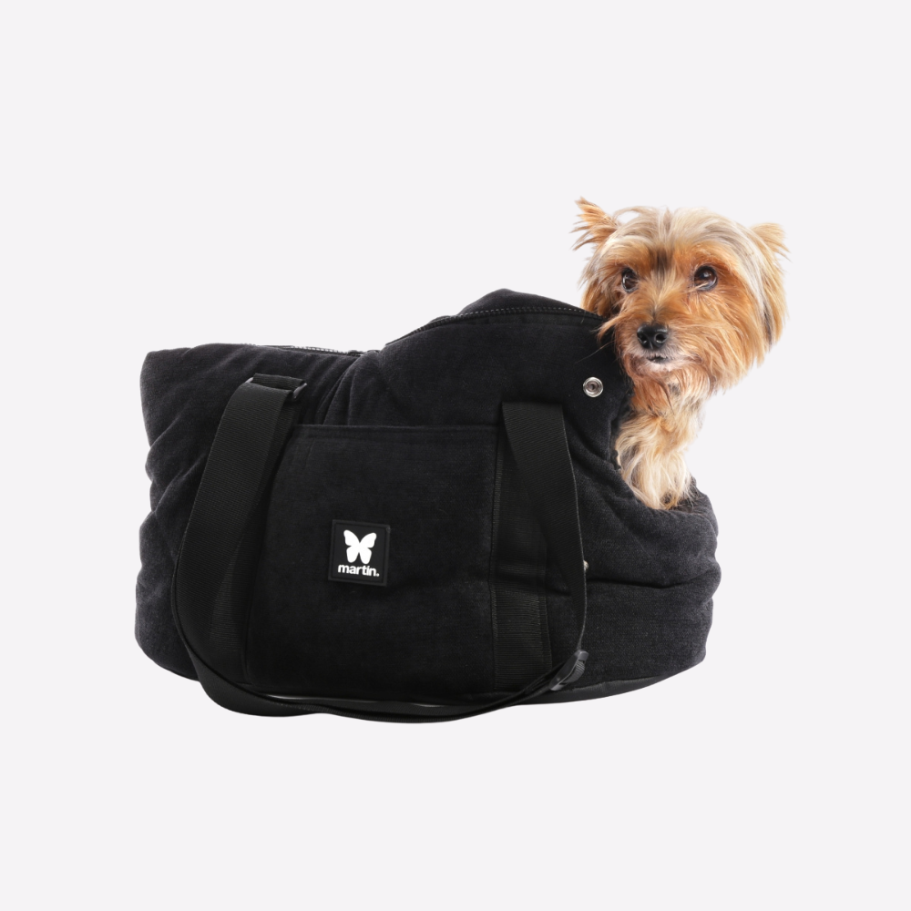 Le Sac de transport et couchage douillet 2-en-1 de la collection Élégante by Martin Sellier© offre un espace de voyage confortable et cosy. Grâce à son tissu extérieur en velours noir, il présente un style classique chic. Conçu pour les petits chiens, ce sac combine à la fois élégance, fonctionnalité et douceur.