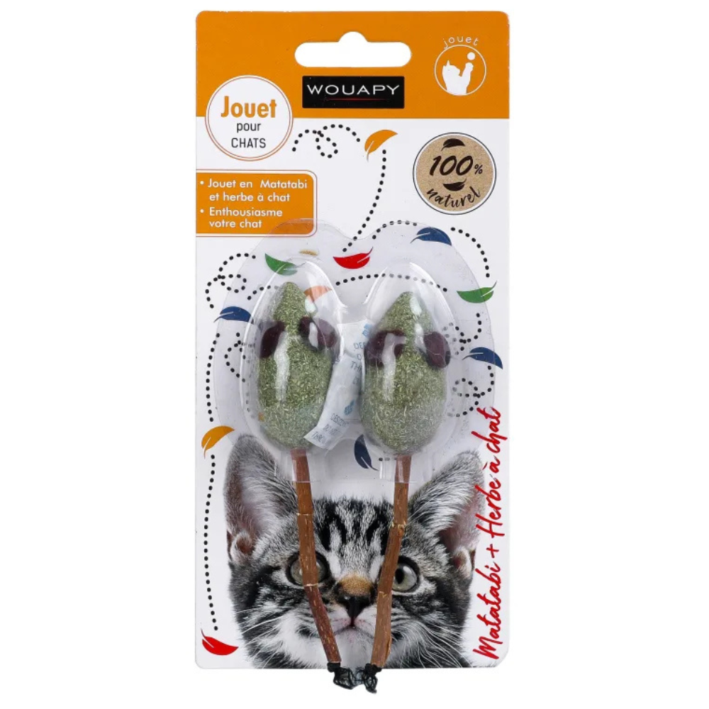 Les Souris en Duo de Wouapy© est un jouet pour chat, naturel et stimulant, pensé pour éveiller les instincts de chasse tout en apportant une véritable séance de jeu sensoriel. Grâce au matatabi et à l’herbe à chat, il devient immédiatement irrésistible pour la grande majorité des félins.